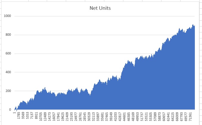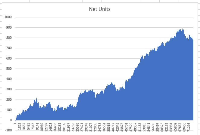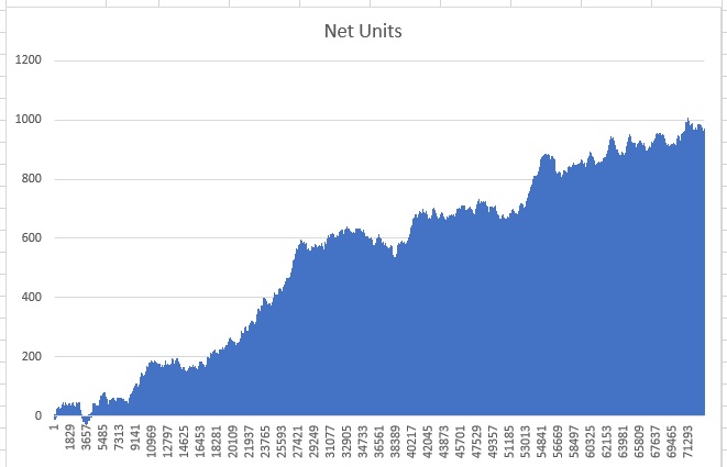 an overall drawdown not exceeding 31 units overall. In random mode, the performance looks like the following: