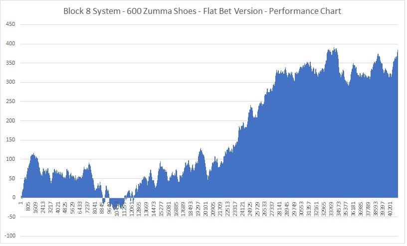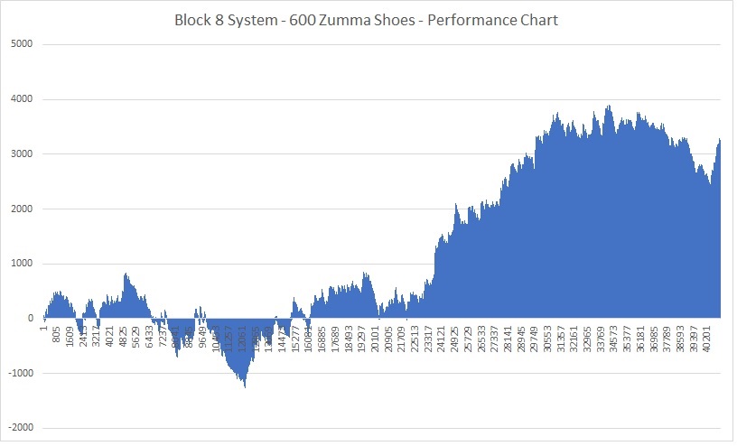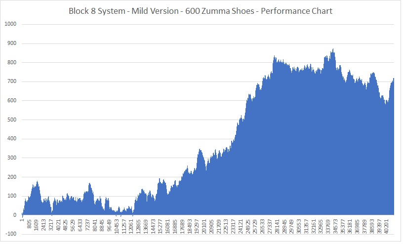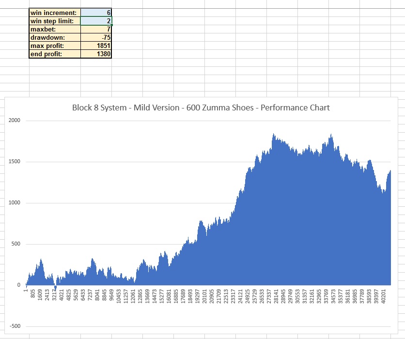 for Even Bets The new system Block 8 System for Even Bets launched 11 days ago was received with great enthusiasm and interest. It had nothing but positive reviews and feedback. An independent tester has received the system and posted his results in the discussion forum. An average of 20 units were made for each 5 shoe set posted. Also, it was observed that the system wins consistently, when a win target was implemented. The best performance of the system was the use of the mild version, that limits the win steps in only 2 and the maximum bet was 7 units. This generates 1380 units for 600 shoes very consistently, averaging 2.3 units per shoe, using any chip denomination. Here's the performance chart of this mode: