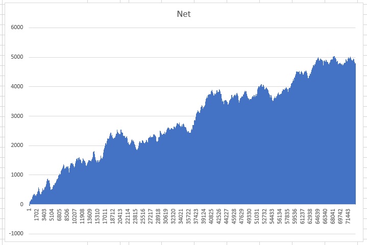 a profit of 4,782 units for 1000 shoes, averaging 4.8 units per shoe. And this is with an overall drawdown of mere 41 units. This is the performance chart of the system: