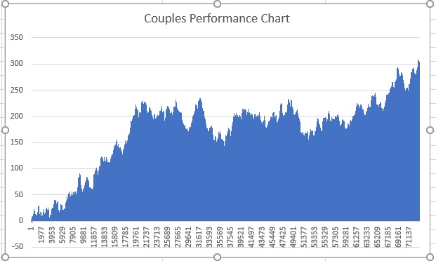 Not that they are getting married or anything and having a wedding cake. Couples is a totally flat bet system and Wedding Cake uses a mild progression. Let's talk about each of them separately then. Couples is based on pairing even bets and their interaction. On even bet systems, such as Roulette, Craps, Baccarat, etc. there are two sides, such as Red and Black in Roulette or Player and Banker in Baccarat, etc. When we couple them and match them in pairs, such as RR RB BR BB, we get four couples. The system analyzes their interaction, their relation, their frequency/odds of appearance and everything associated to those pairs and comes up with a fine, solid flat bet system, that provides you rising profits per usage. Since we are dealing with pairs or couples, the system bets every other bet, as it needs to identify the first partner of the couple first and then determines which couple should come up next based on statistical data. The system is very simple to use, although was not easy to develop. When you see a musician perform a hard piece, if it's well practiced, it looks and sounds pretty easy, but I'm telling you, it took lots of hours to get it to that stage. Here's its performance chart: