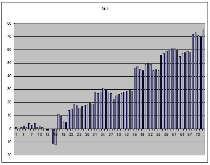 for Zumma Craps? Within 3500 decisions, the system generated 646 units, all abandoned runs included. Q: Hello Izak: Q: What if the +50/-50 parameters were dropped to say +30/-30 for each player, or would this not be giving the system enough room to "breathe?" Meaning is the 30/30 too tight to win same percentages as the 4-1 you have previously mentioned? Greed is one of the two components that keep people from succeeding in the long run. Personally, I would be overjoyed if you came back and said, "Dream" can win 5-1 or 6-1 if you use the +20/-20, or +30/-30 parameters. Seems one could play shorter, more shoes in a day with less stress. Even if +30/-30 still produced a 4-1 ratio, I for one would prefer it over the thought of losing, say 50 in a shoe. A: I ran some tests