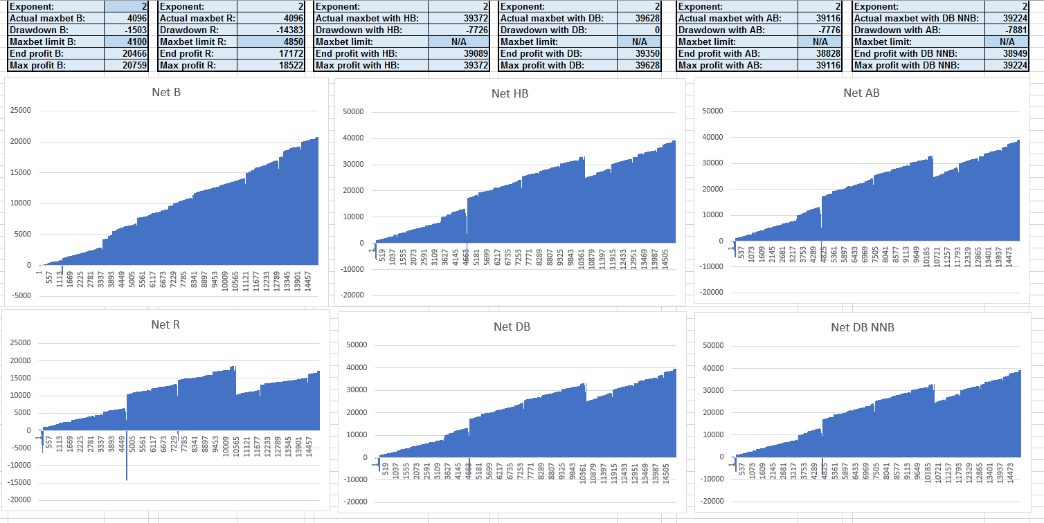 system. Thank you all for your very valuable questions. One customer asked if the system can be used with differential betting, meaning that one would use both sides Red and Black and bet on the difference of the bets and place a bet on the side that requires the higher bet. Well, it was a very good question, since the system wins on either betting B only and betting R only. So I ran a few simulations, 6 of them: