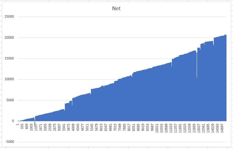 You will ask how many abandoned runs? The answer is none! No abandoned runs whatsoever. The system closes every run with a profit. And not just with 1 unit profit like a grind system, but as many as 20 units and more. Average profit is $20,466 / 15,000 = $1,36 per spin. If a spin takes a minute, one makes $81.86 per hour. For a 5 hour daily play, the profit is $409.30 a day with $1 chips!! One makes $4K a day with $10 chips. Whatever suits your budget. The complete simulation for all 15,000 Zumma spins is included in your purchase. One bets every single spin with no interruptions, no tracking. The above chart is for betting Black only. Similar charts for other even bets.