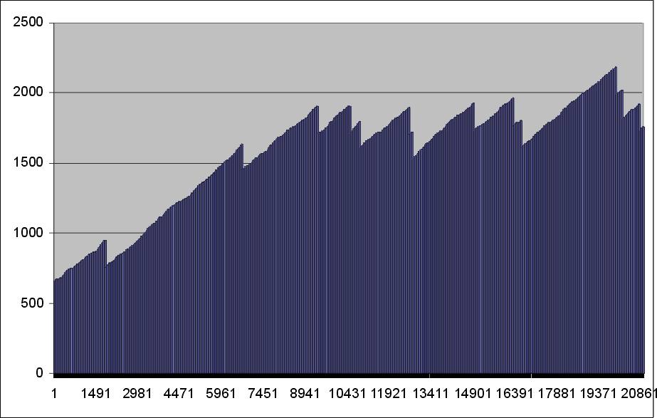 thousands of units This system is based on a very original idea I had a few months ago and the last 4 months' live play and tests have shown a huge profitability of the system and it's time to share it with you by having it available on the market. The forte of the system is its betting method and therefore it will work with almost any bet selection you may have. F4 works for all even bets, for Red/Black, High/Low, Even/Odd in Roulette, for Pass Line/Don't Pass Line in Craps, Player/Banker in Baccarat, Big/Small in Sic-Bo and Casino War. You could use either side of an even bet or one of your favorite bet selections, F4 will generate thousands of units on the long run. You must be wondering if F4 uses flat bets or a progression. The answer is both. If your bet selection does fine with flat bets, then the system remains in flat bets. Should your losses become more frequent than your wins, the system switches you into a progression mode, where a win or two will bring you back straight into your flat betting zone automatically. Each completed run generates 1 unit profit. The system can be played with various loss limits for a particular session, each limit providing different levels of profits. Just to give you an idea on its performance, F4 generated +656 units for the first 20,000 hands of the Zumma tester book on 600 shoes. Alternating bet selections, F4 generated another +900 units for the second set of 20,000 decisions. With a 53 unit session bankroll, F4 generates more than 600 units, about 1 unit per shoe in average, taking losses and commissions into account, for the entire Zumma 600 Baccarat shoes, for which a lifetime bankroll of 100 units is sufficient. The largest drawdown for those profits was not more than 60 units overall. With a 196 unit session bankroll, F4 generates 1500 units for the entire Zumma 600 Baccarat shoes, or 2.5 units per shoe in average, for which a lifetime bankroll of 400 units is more than enough, also having taken losses and commissions into consideration. The largest drawdown for those results were not more than 180 units. Within the first 20,000 decisions, the session bankroll of 196 units is lost 13 times, which does not affect overall profitability, which reaches 1200 units at peak. Within the second 20,000 decisions, exactly the same occurs, that is, 13 lost sessions, reaching 2200 units at peak, despite the fact that we change bet selections, which shows that the system is bet selection independent and wins consistently. The following profit graphs will show you what I mean, the first one for the first 20,000 hands and the second one for the second 20,000 hands of 600 Zumma shoes.