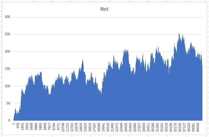 As you can see, the lowest value is 1 unit, the very first chip we place on the table and we don't lose it. The remaining graph is always positive, always in profit. And there is a new maximum at every point. Used parameters are: