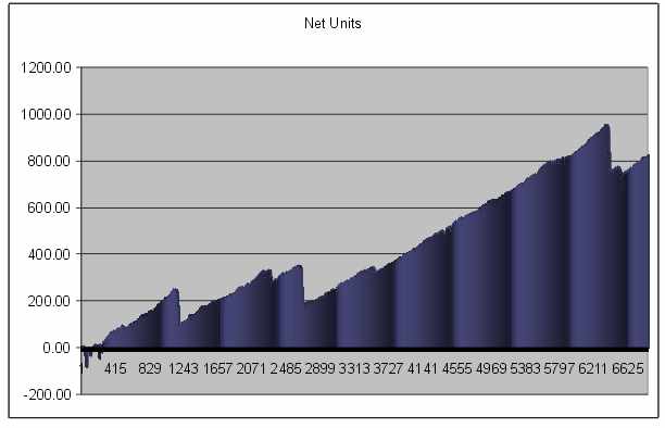 etc. A total drawdown hardly exceeds 150 units and profits can rise up to more than 1000 units for 100 shoes or 7000 decisions. Here is a graph of the system's performance: