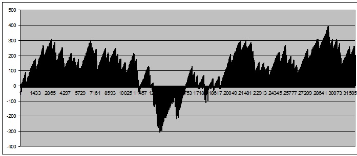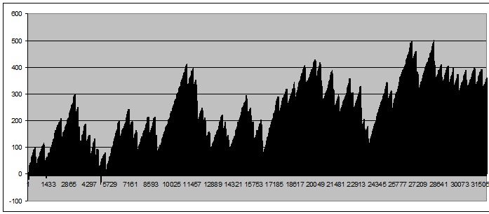 Not bad for a negative expectancy game, such as 00 Roulette with 5.26% house edge. All with nothing but one chip bets every time. The graph goes never below zero. Elasticity is based on