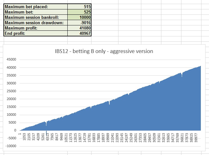 IBS series, time it took to perfect it. IBS12 achieves more than all that. First of all, the profits are overboard. It's no longer a grind system that makes 1 unit per run. As the name and the version implies, it makes exactly 12 units per run. And the runs are not too long. Usually it takes 1 up to 11 decisions to generate those 12 units. 100 units are generated per shoe and per each played shoe!! That's an outstanding performance!! You can use the system for any even bet game. It will perform similarly. With special techniques the maximum bet is reduced to 40 units or to any size you feel comfortable with. It will work in all cases. It's, of course, a cancellation system, but better than all others. The more you advance in the run, the better chances you have to close the run with, yes, +12 units profit each time. And the closure of the runs are guaranteed. The system has seven different options to use. It's like buying seven different systems with the price of one. Each variation is adjusted to suit the player's style and budget. In some options all runs are closed without abandoning any one. This is achieved with a max bet of 515 units. With that option, the system generates 40,967 units. Here's the performance chart of this version: