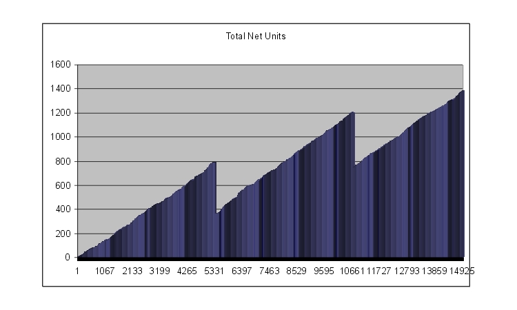 Baccarat, the total profit is 2213 + 414.95 = 2627.95 units. Playing at $20 Baccarat tables, this makes a profit of 2627.95 X 20 = $52,559 for 600 shoes including abandoned runs, commissions, etc. Since each shoe takes about an hour to play, this profit can be made in 600 hours of play, or about 2 months, depending on the frequency of your play. As per Roulette, the system generates a profit of 1384 units playing for instance on the Even and Odd sides for the entire 15000 Zumms spins. On the Even side, it generates a profit of 1106 units and on the Odd side, a profit of 278, totaling to 1384. This is achieved with a maximum bet set to 400 units and only 2 runs are abandoned throughout all 15000 spins. The average profit for Roulette is thus 1 unit for every 30 spins per even bet side. You can apply the system to all 6 even bet paying sides (Reds, Blacks, Evens, Odds, Highs and Lows) either alone or with a team of friends and multiply your profits 6 fold. Here is the performance chart for the Even and Odd sides using IBS9 for Roulette: