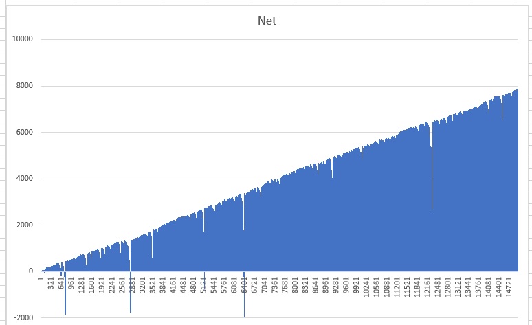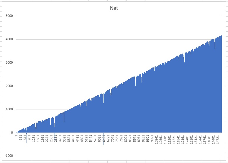Always steadily increasing profits. By the end of the 15,000 Zumma spins, the system generates 7,843 units, more than a unit every 2 spins on average. And it's not a grind system at all, where one wins only one unit at the end of the run. Profits per run can vary between 3 and 11 units and every run is in profit. The system will work on 1-1000 ranges, which most roulette tables are. A total bankroll of 2000 units will be ample to use the system indefinitely and be always in profit. A milder version of the system generates 4178 units and requires 4 times less bankroll: 500 units and the performance chart remains exactly in the same proportion: