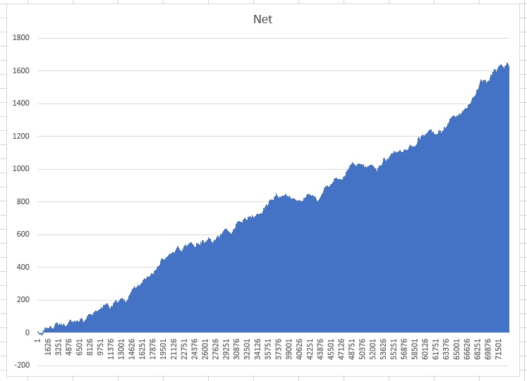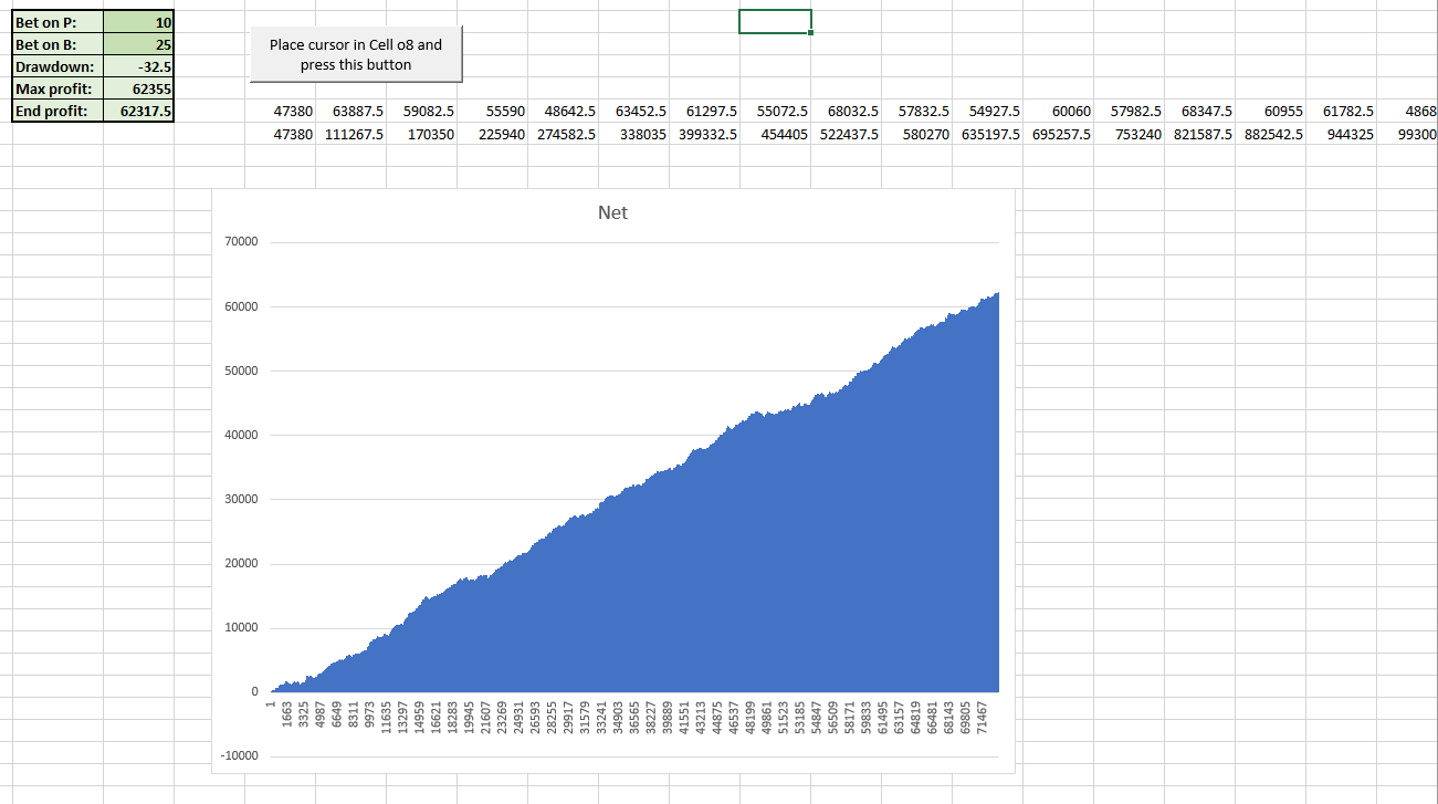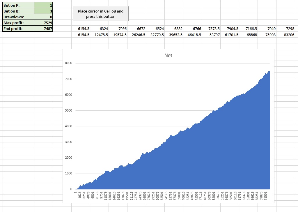 +7,487 units for 1000 random shoes are quite remarkable particularly with 0 drawdown. If you noticed in the chart, the simulation has a macro which will run the 1000 random shoe simulation 100 times, giving you positive results at every run averaging 7000 units for 1000 shoes, or 7 units per shoe. In terms of $'s one can use also $10 bets for smaller bets and $25 bets for the higher, second flat bet mode combined and the result is also the same steadily increasing profit chart: