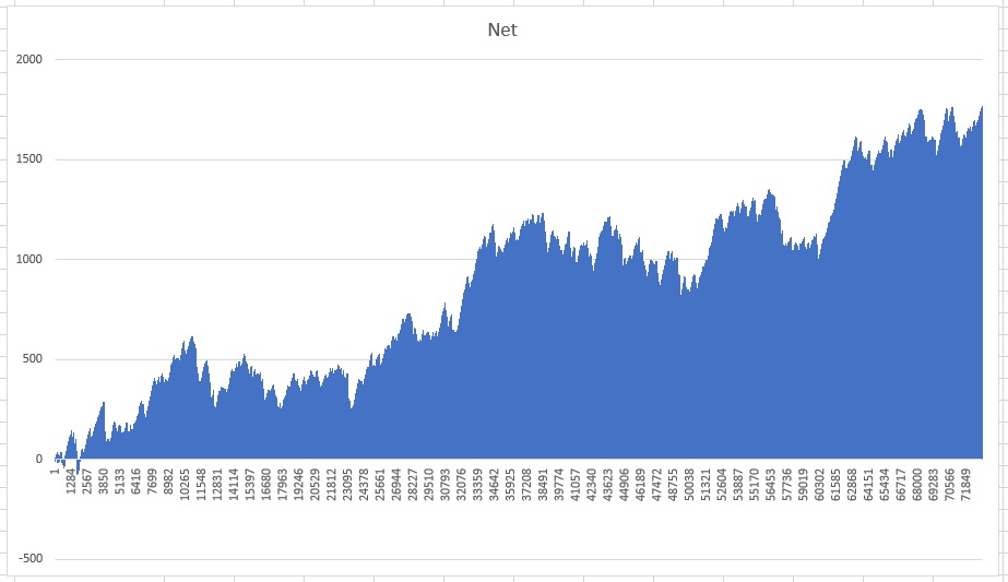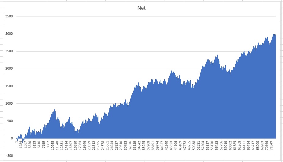 Exactly 3000 units are obtained for 1000 shoes, averaging 3 units per shoe. The maximum bet ever placed being only 32 units. And this is just an optimized parameter to maximize profits. Otherwise, we could go even milder and have a maximum bet of only 14 units and we get a similarly proportional profit chart: