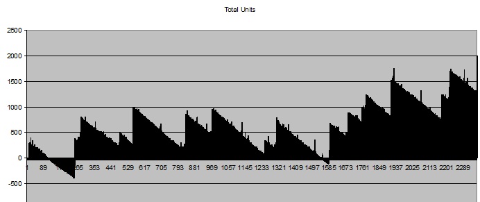 bet can multiply into numerous profits. Parlaying a bet simply means letting your bet ride if you win that bet. For instance, you place one chip on a dozen. If you win that bet, you now have 3 chips on the table. You don't touch that bet and let it ride one more time. If your bet wins again, you now have 9 chips on the table on that particular dozen. If you don't touch that bet and let it ride again and your bet wins once more, you now have 27 chips on the table. All this replicated from the very initial one chip you placed on the table. If you cash your winnings now, you will have 26 units profit. 27 chips minus the 1 chip you placed initially. Whether you should cash your winnings at this stage or not will depend on what the system will instruct you based on its specifications. In a progressive system, we increase our bets as we lose. In a Martingale double up type of system, for instance, we place 1, 2, 4, 8, 16, 32, etc. chips on the table until our first win. And that gives us only 1 unit profit. We are investing 64 chips in order to gain 1. In the parlay type of betting, we invest only 1 chip and as we continuously win on that bet, our chip multiplies to 2, 4, 8, 16, 32, 64, etc. units. We are investing 1 chip in order to gain 64, exactly the opposite of a Martingale. Sounds more attractive and less risky, doesn't it? Except that in a progressive system, we are more likely to win on our fourth, fifth, etc. bet than having 4-5 wins in a row. But our investment is much higher for a smaller gain. In the parlay method, we risk only one unit in order to gain much more. In either case, one does win the fourth or fifth bet and one does win 4, 5 times in a row, when the time comes. MPRS takes advantage of the fact, that parlay bets do eventually win and those wins are very profitable risking a very low amount of units, in fact just 1 unit. This is the minimum and maximum bet you will ever place on the table - never more than 1 unit. That's what makes the system extremely low risk. No more aggressive progressions, betting hundreds of units, just in order to make 1 unit profit. On the contrary, you place single chips here and there and see them replicate and multiply without your intervention. MPRS will show you systematically how you can set a certain win target and achieve it more frequently than you hit your stop loss. Since this is a parlay system, it would not make sense to set a low win target, as we want our chips to replicate as much as they can and they will. And we don't want this to be a grind system giving us only 1 unit profit for each run. MPRS has two variations of the system, a mild one and a slightly more aggressive one. The mild one will set a win target of 30 units for a run and a stop loss of -20. The more aggressive one will set a win target of 250 chips for a run with a loss limit of -41. That's the only difference. Otherwise, the system specs are completely identical. With the mild system, the winnings are more gradual. With the more aggressive one, the winnings are quicker, if you can afford a slightly larger drawdown, such as 392 units for the entire usage of the system, which is practically your lifetime bankroll you will need. A win goal of 2000 units is set and is achieved within 2362 spins. Those are for Zumma 15,000 spin tester book. If MPRS beats the entire Zumma book? Absolutely! It generates 23,193 units by the end of 15,000 spins. The parameters set for Zumma, however, are even more aggressive. That's why the middle system milder version is the one recommended to use, trying to keep the bets at the table limits. And that's the simulation you will receive with your system purchase. Yes, your single chip may replicate into very high amounts with MPRS, exceeding even some table limits at times. When that happens, you will have to take some of your winnings with you and put them on the side and continue the use of the system until you reach your win target. Here is a performance chart of MPRS for the win goal of 2000 units:
