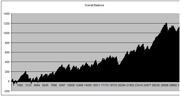 EZ Baccarat System "can be played indefinitely with steadily rising profits" Yes, absolutely. And this new system Panda Betting EZ Baccarat System does exactly that. It's a counterpart of the Dragon Betting, except that this time it takes advantage of the Panda side bets in EZ Baccarat. The betting method is quite different though. Exactly the same strategy as the Dragon system could not be applied, due to the fact that Pandas are more frequent and we could take advantage of gaining profits out of multiple pandas showing up within the same shoe, as opposed to quitting the shoe or rather half shoe the moment the very first Dragon appears. In fact, there is a number of 3 Pandas per shoe in average. At times, you could have 7 Pandas in a shoe and very rarely no Pandas at all. Extensive tests have been conducted using this new strategy. The simulation shows again steadily rising profits the more the system is used. Also all shoes tested and photographed for the Dragon system (more than 150 of them) have shown to have created profits using this new strategy. So, it's another win-win system. The simulation has 834 random shoes, that show results for every single decision, that is every hand of every shoe. Why 834? Well, simply because the simulation is in MS-Excel and the spreadsheet can hold a maximum of 65,536 rows, where 834 shoes fit in up to the last 11 lines. The last 11 lines are utilized to show end result statistics, such as the number of Pandas, Player, Banker, Tie Decisions, average number of Pandas per shoe, the frequency of Pandas, etc. A parameter also enables to set different loss limits for various end profit results. The optimized value is 75, which is going to be your session bankroll. Should a shoe have no Pandas at all, that's the most you could lose. Statistically, the chances of this happening is one in 10. So, if you lose 75 units once every 10 shoe and gain between 10 and 25 units per shoe, you are in very good shape for long term profits. The simulation can be run as many times as you press F9, that is, indefinitely, and it will show profits of a few thousand units for the 834 shoes. In fact, after running it over 100 times, an average profit of 1500 units have been established for the 834 shoes, which gives you an average profit of 1500/834 = 1.8 units per shoe very consistently. This may not seem much, but, since the system is flat betting, you can use large unit denominations, such as $100 or $250 or whatever your budget allows. At $100, you can make $180 per shoe or per hour. You will be playing less than an hour, as you will not have to sit throughout the entire shoe all the time. If you play 5-6 shoes a day, this will amount to a profit of $1000 a day. At $250 a unit size, you can make up to $2500 a day, which is quite decent. Following is a typical performance chart of the system: