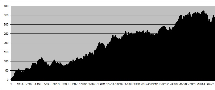 As you can see, the small straight horizontal lines are the times where we wait for the right time to bet. Every time we run this simulation over thousands of random shoes, we get a similar graph of profits raising constantly over time. About 400 units for 600
