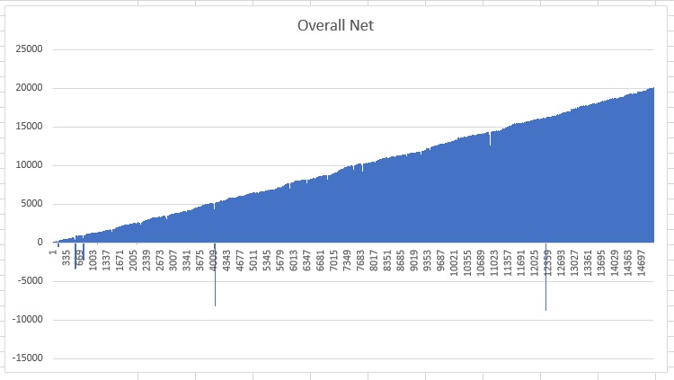 all 15,000 spins" Here's a system that beats roulette completely for all 15,000 spins, never abandoning a run and never failing a run. It's designed for roulette only as it bets on the single dozens and single columns having a payout of 3 to 1. It is very satisfactory to win on single dozens and single columns. If we place one chip on a dozen and one chip on a column at the same time, if both bets win you get 6 chips back profiting 4. If only one of the bets win, you are ahead by 1 chip and if you lose both bets, you're down only 2 chips. Of course, chances of winning on a single dozen or single column is 33%. So the above doesn't beat the odds. In fact, nothing beats the odds. It's mathematically impossible. Our goal is not to beat the odds, but to overcome the odds and make huge profits despite the odds, which is exactly what the RDRC systems do. Yes, there are 2 systems included in this package with variations in their bet method and with the same efficient bet selection. Both are tremendously profitable. Betting with only $5 units, one makes exactly $20,128 on all 15000 spins and yes one bets on each spin. In terms of units, this means 20,128 / 5 = 4,025.6 units. The unit size will totally depend on your budget. The performance chart is astounding, as the systems have no failing runs nor do we abandon any one of them. They all close with a profit. Here's the performance chart of System 1: