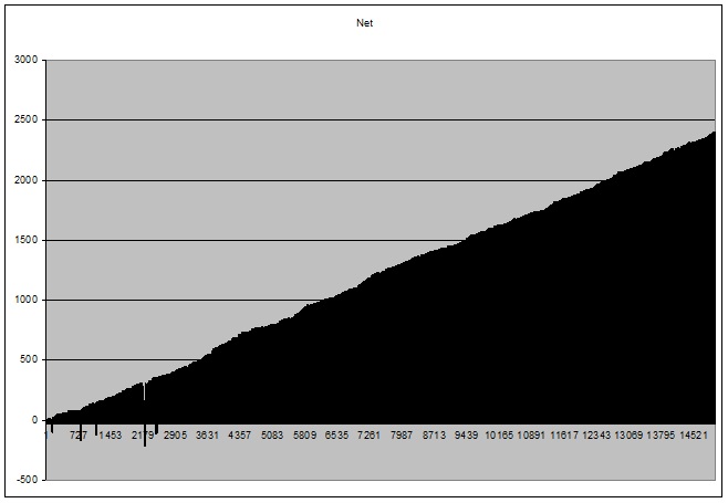 A linearly rising profit chart with no losing runs whatsoever on a double zero Roulette game with 5.26% house advantage. Truly amazing! The system comes with a full MS-Excel simulation of the entire Zumma 15,000 spins verified for authenticity and integrity. You can study the details of each run and see how each one of them is closed fully. The maximum bet limit is set to 223 units, which enables this performance. This high bet is placed only once throughout the entire system. The remaining time bets are controlled at a pretty low level. A lifetime bankroll of 668 units are sufficient should you ever start your play with the worse case scenario. Otherwise, 213 units are the lowest you can ever go with this system, before you reach +2,398 units at the end of 15,000 spins. This gives you an average profit of 1 unit every 6.25 spins or 0.16 units per spin. If a spin takes a minute, the system will profit you 10 units per hour. At $10 bets, this means about $100 per hour consistently. The system is not complex and the new concept will be simple to understand when you study the fully detailed two examples. the system document is only 12 pages of easy reading. Blank templates are provided for you to print and take to the casino in order to use the system most efficiently.SRDDW goes for $4,000 and is worth every penny. As usual, your full satisfaction is guaranteed. If not, you can have your money back within 30 days of your purchase, no strings attached, no questions asked. Click here to order and a download link will open immediately after your payment online. Thank you! Email: webmaster@letstalkwinning.com or izak.matatya@videotron.ca Systems Gallery: