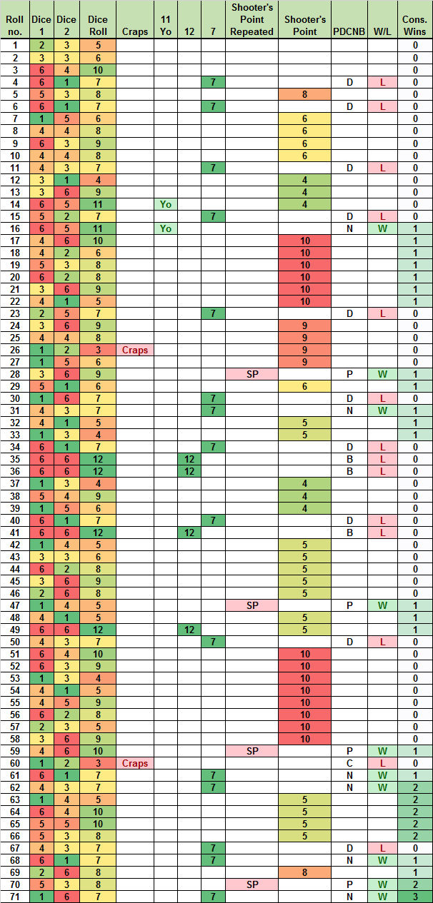 Here's a fabulous new system for you: TWS - Triple Win System for All Even Bets. One of the best systems you will ever have for even bets. Low budget, totally infallible, easy to use. Everything you can expect from a great system. The system package is very rich. You will have multiple simulations for all even bet games: for Craps, Baccarat and Roulette. A lot of work went into developing this system. You will find my very first full scale Craps simulation, that shows you every dice roll, outcome, wins and losses for the Pass Line and for the Don't Pass Line and how the strategy is applied to give you continuous and uninterrupted wins. Here's a sneak preview on how the Craps simulation looks without revealing the actual bet method and how consecutive wins are shown.