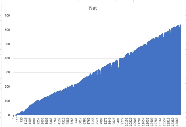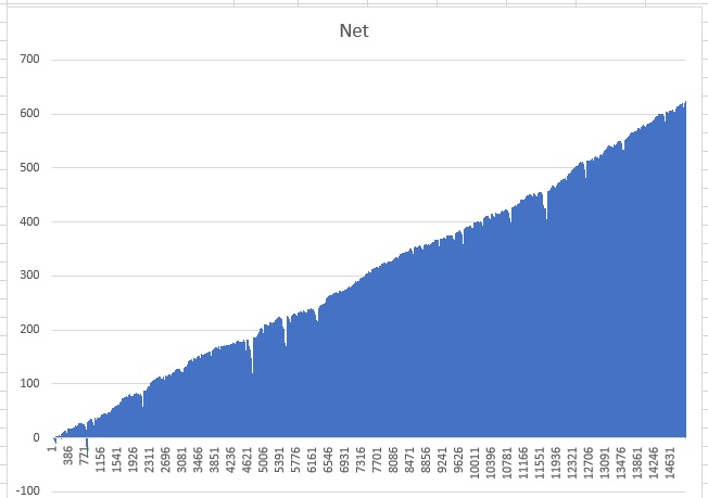 amounts to be bet simultaneously without taking their difference. This, not only reduces the size of the bets, but also triples the profits made at the end. Here are four performance charts for each option: