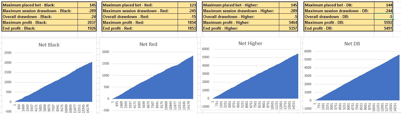 Making 10,925 units for 1000 shoes averages 11 units for shoe, a stunning performance! When it comes to Roulette, the system is very flexible. You can bet on Red only, or Black only or any other even bet. And you can bet on the combinations of the even bets. Taking Red and Black only, each side will perform just as well, like all the graphs you have seen so far. Single or double zero tables don't matter. A zero is simply a loss, and it doesn't affect the performance at all. And it usually costs only 1 unit. The options you can have in the even bets of Roulette are choosing only one side, such as Red or Black only, or use them both simultaneously with two different techniques. We'll