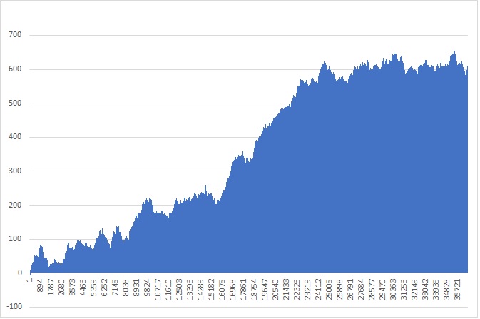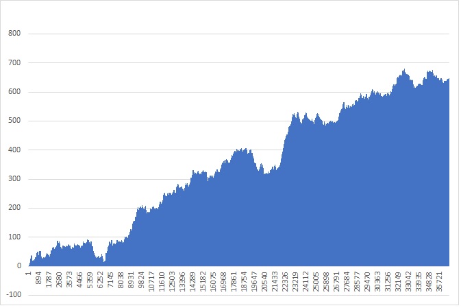 Even better performance, generating 629 units with a drawdown of only 3 units.