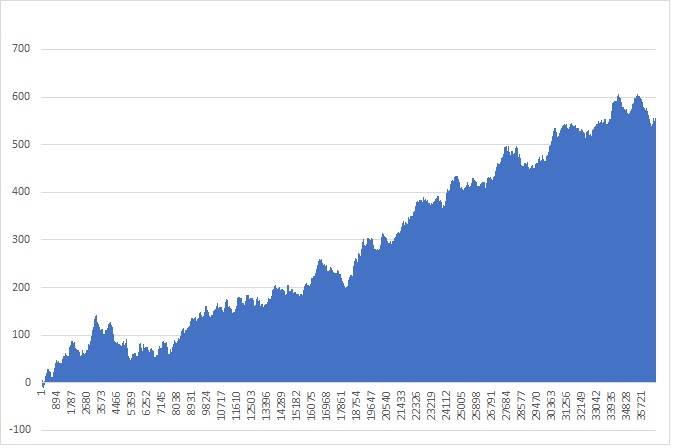 Quite incredible. I can hardly believe it myself. After having developed so far 94 systems, I had to overdo myself. System 3 does not generate more units for 500 shoes, but has a more steadily increasing profit chart, which could be more acceptable to players not wishing for large swings in their play. Here is its performance chart: