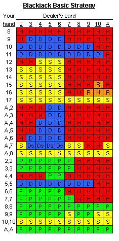 1) Stand if you hold 12 to 16 and the dealers up card is 2 to 6. For a detailed, accurate basic strategy see the table at the end of this page. How-to-Win Strategy: Now that you know the elementary rules of how to play blackjack, let me show you the method I use in trying to win: Risk your own money cautiously, but take the double or nothing approach with your winnings. Lets assume you have a $100 stake and you are playing at a $5 table. Bet $5, when you win bet $10, win bet $20, win again bet $40, win once more bet $80. You might be reluctant to risk $80 in one whack, but look at it this way: If you lose the gamble has only cost you $5 of your own money . . .but if you win youll collect $160! A $100 stake at $5 a hand gives you 20 chances to try this system. If Lady Luck is by your side and you get five winning hands in a row, dont get greedy. Go back and start with a $5 bet, trying to repeat the process. Watch your chips closely, if you dont get another lucky run in short order, stop playing while youre ahead. Youll feel much better if you quit a winner. Enjoy your blackjack and Good Luck. Want to get started right away? Try Cybersportsbook and Casino